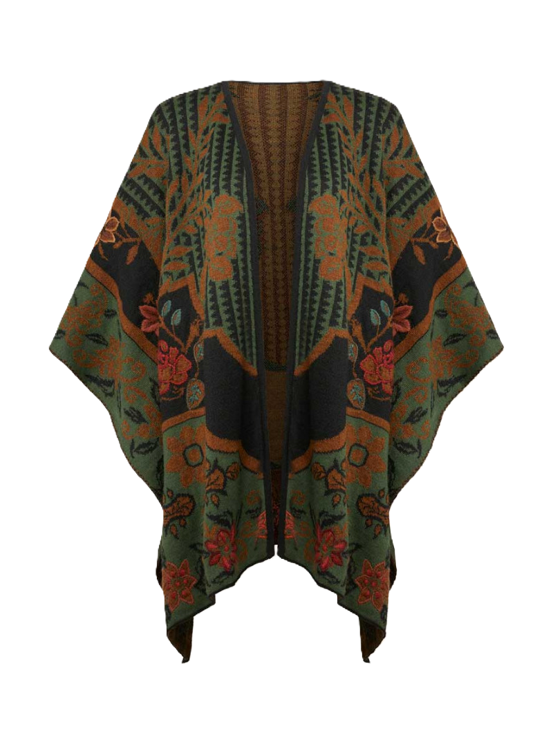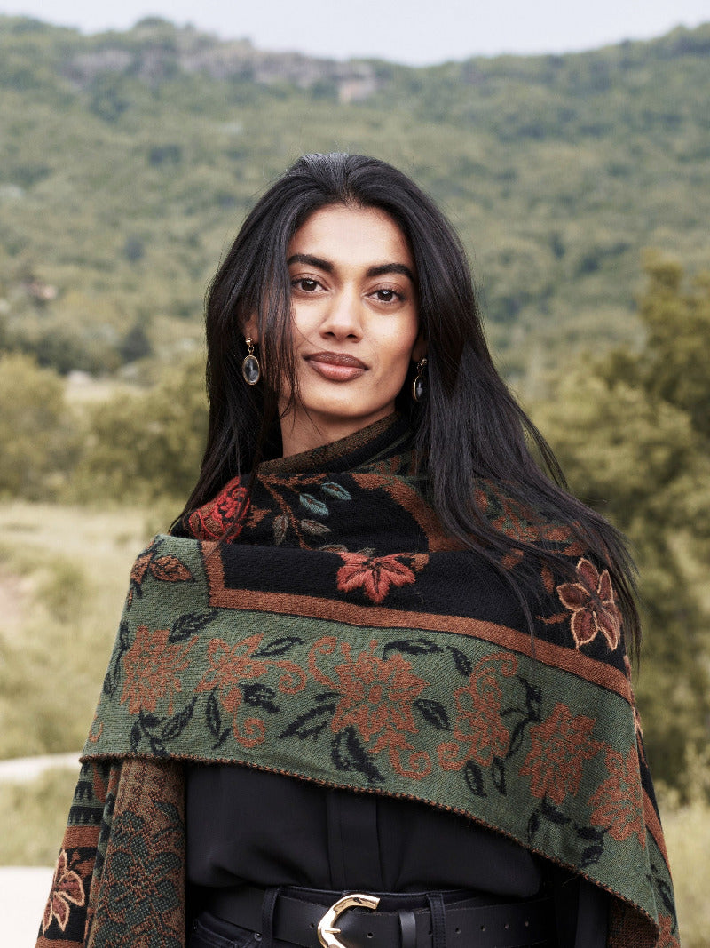 The Gypsy Alpaca Ruana showcases a stunning rose and floral pattern that blends beautifully with rich green and burnt red hues. Artfully hand embroidered. Whether draped over a shoulder for casual outings, or layered for more formal occasions, this beautiful ruana elevates any look.