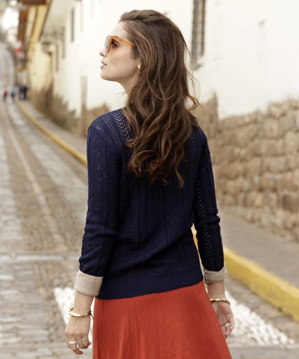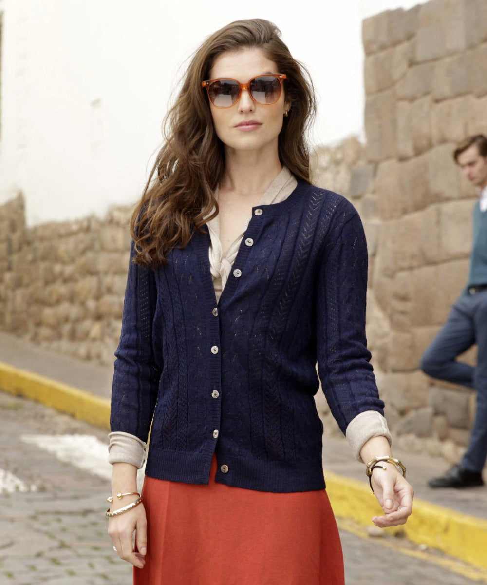 The glorious Natalia Cardigan is made from 100% Baby Alpaca, and with an array of delicate and intricate knit patterns. Premium composition and ultra lightweight gauge make it soft to the skin. Mother of pearl buttons adds a further touch of elegance to this heavenly summer knit.