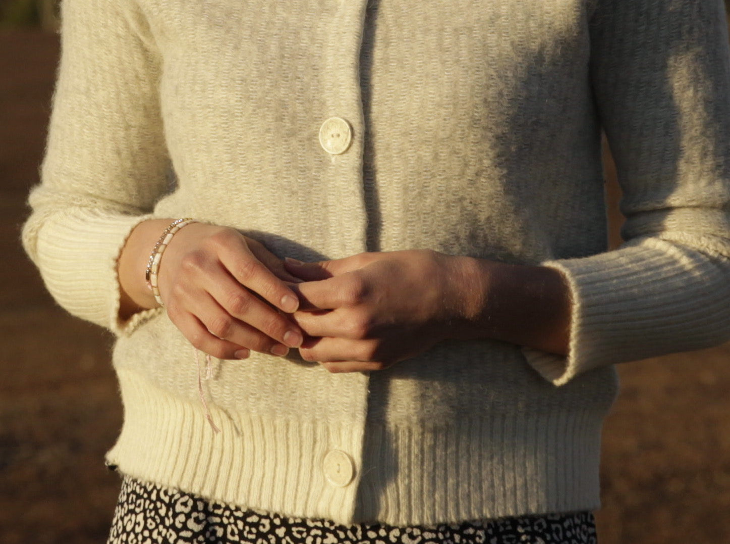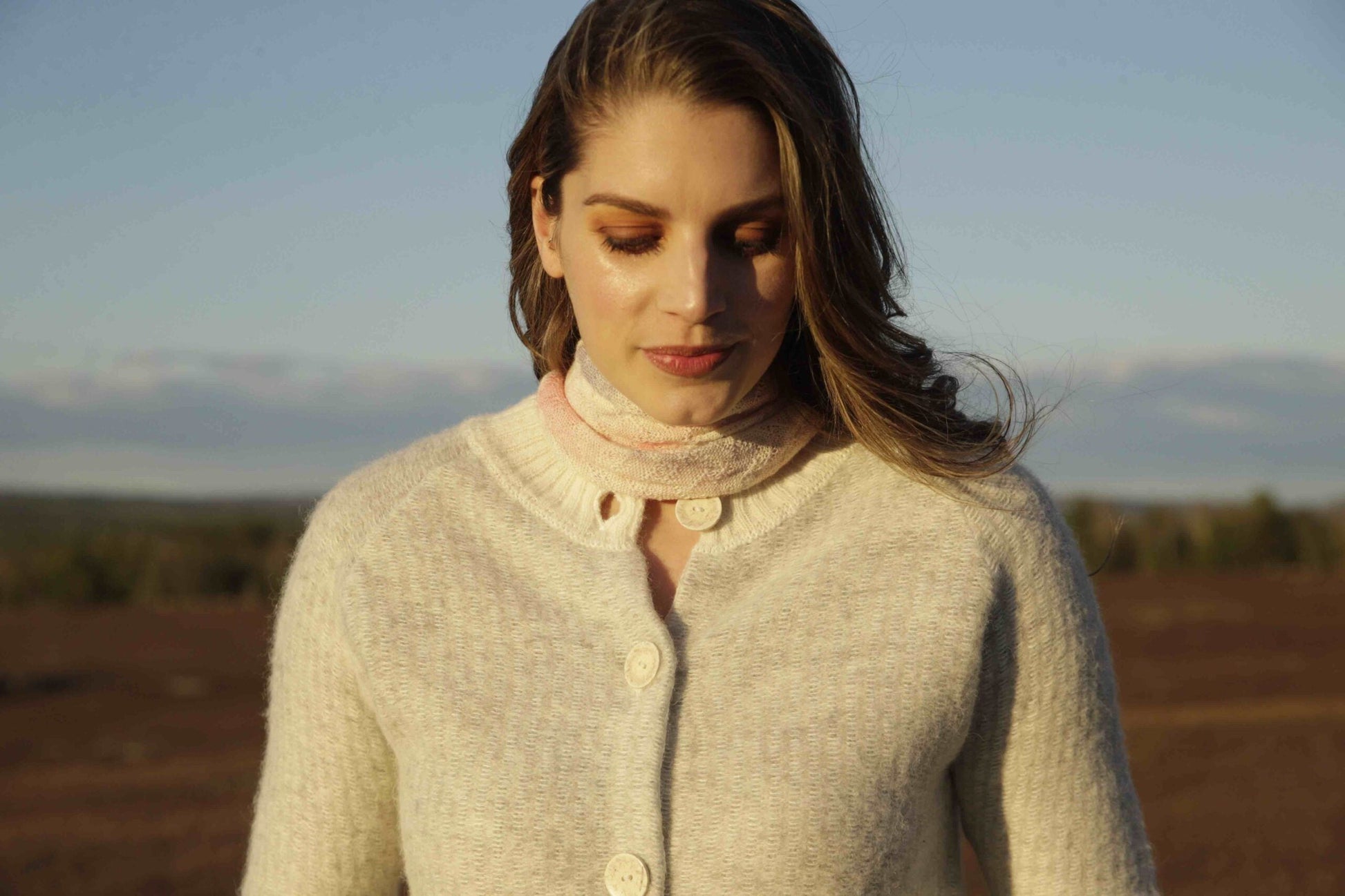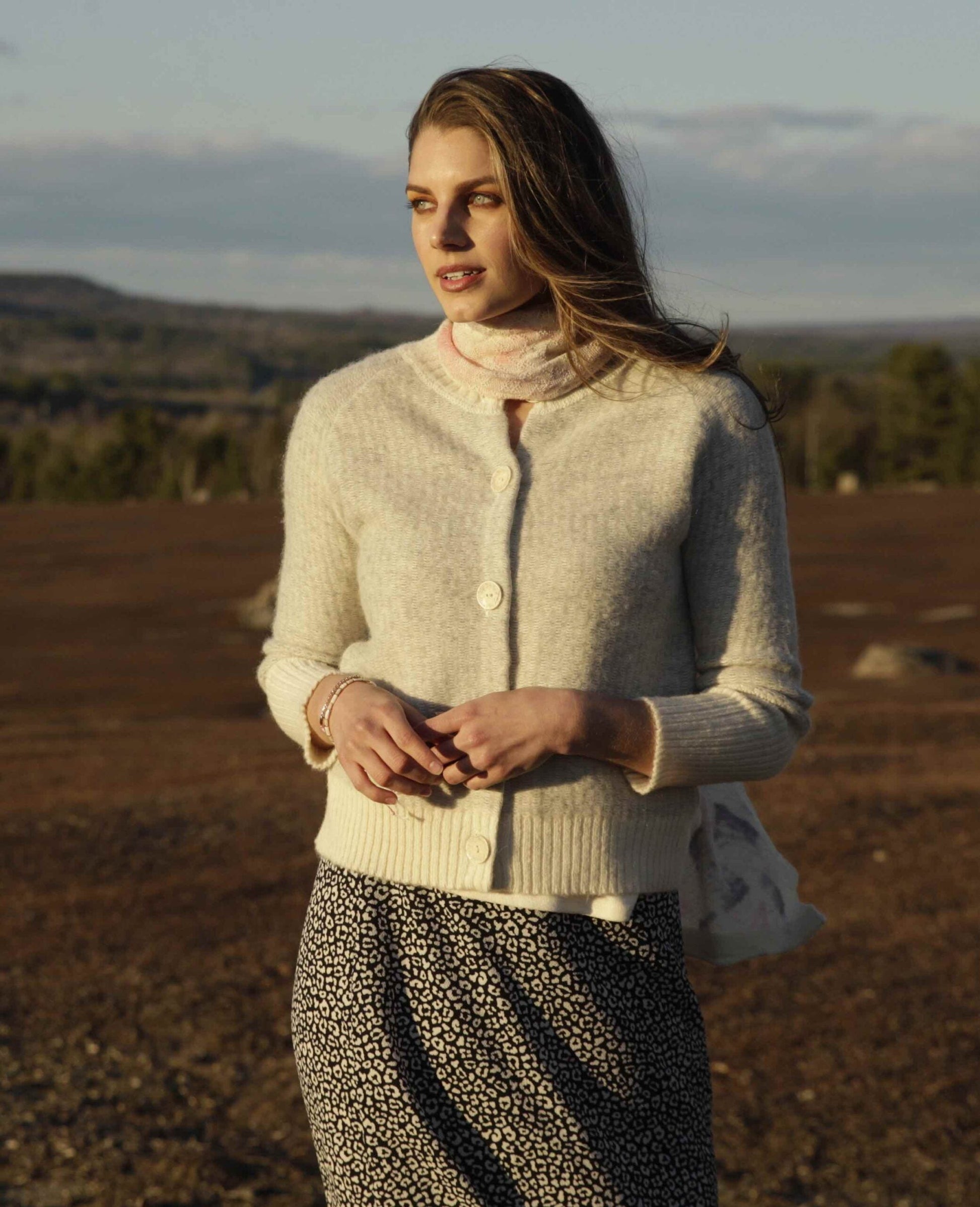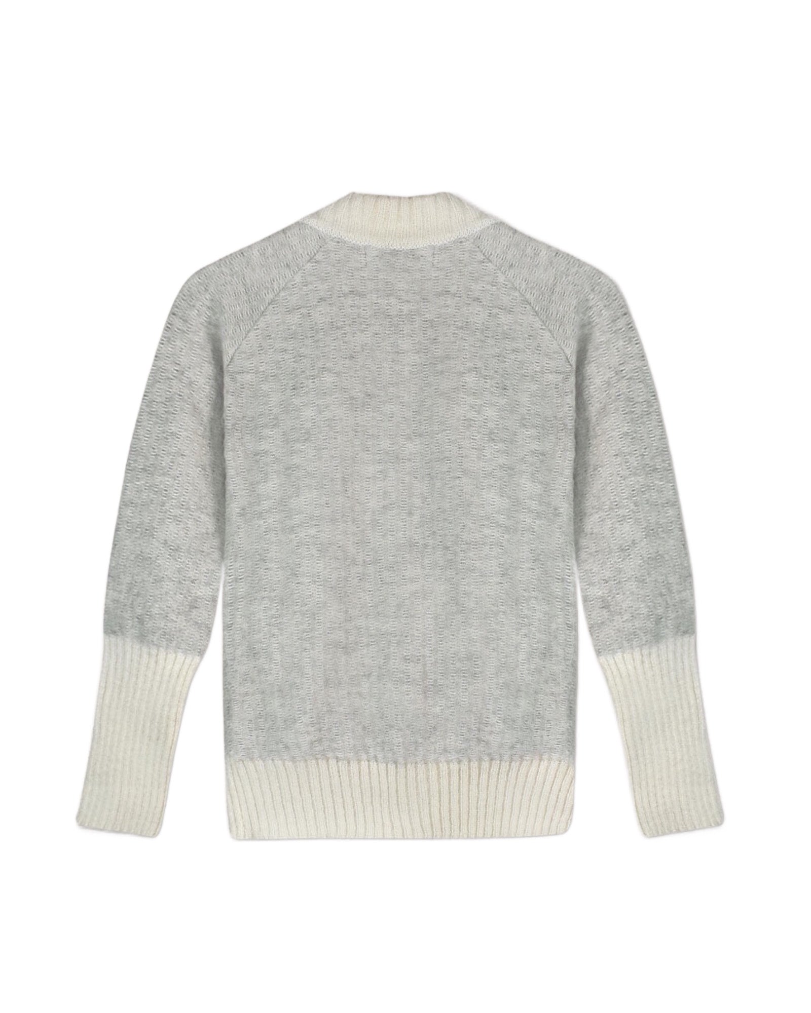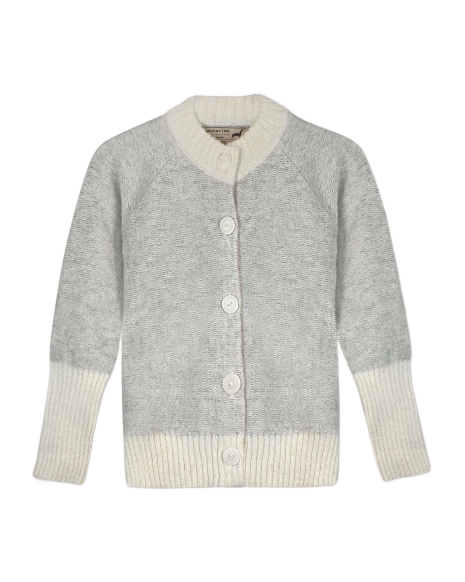 Chic sophistication with a Parisian feel. The Olivia Cardigan is made from a baby Alpaca and Merino wool blend, with a soft gray mélange body alongside ivory ribbing. Featuring 5 marble effect buttons, ribbed sunburst neckline, hem and extended cuff. Versatile and timeless. Sits at natural waistline.