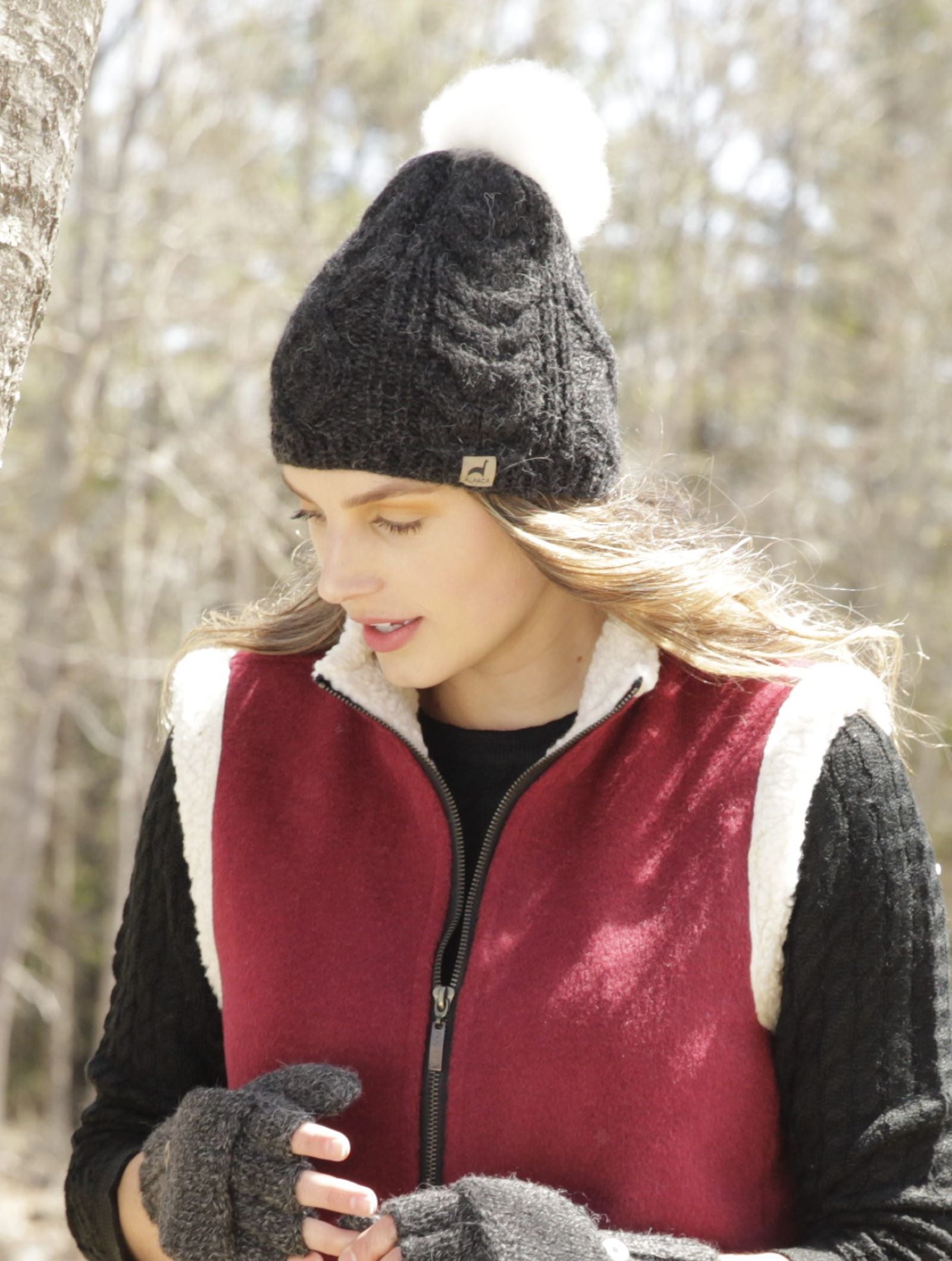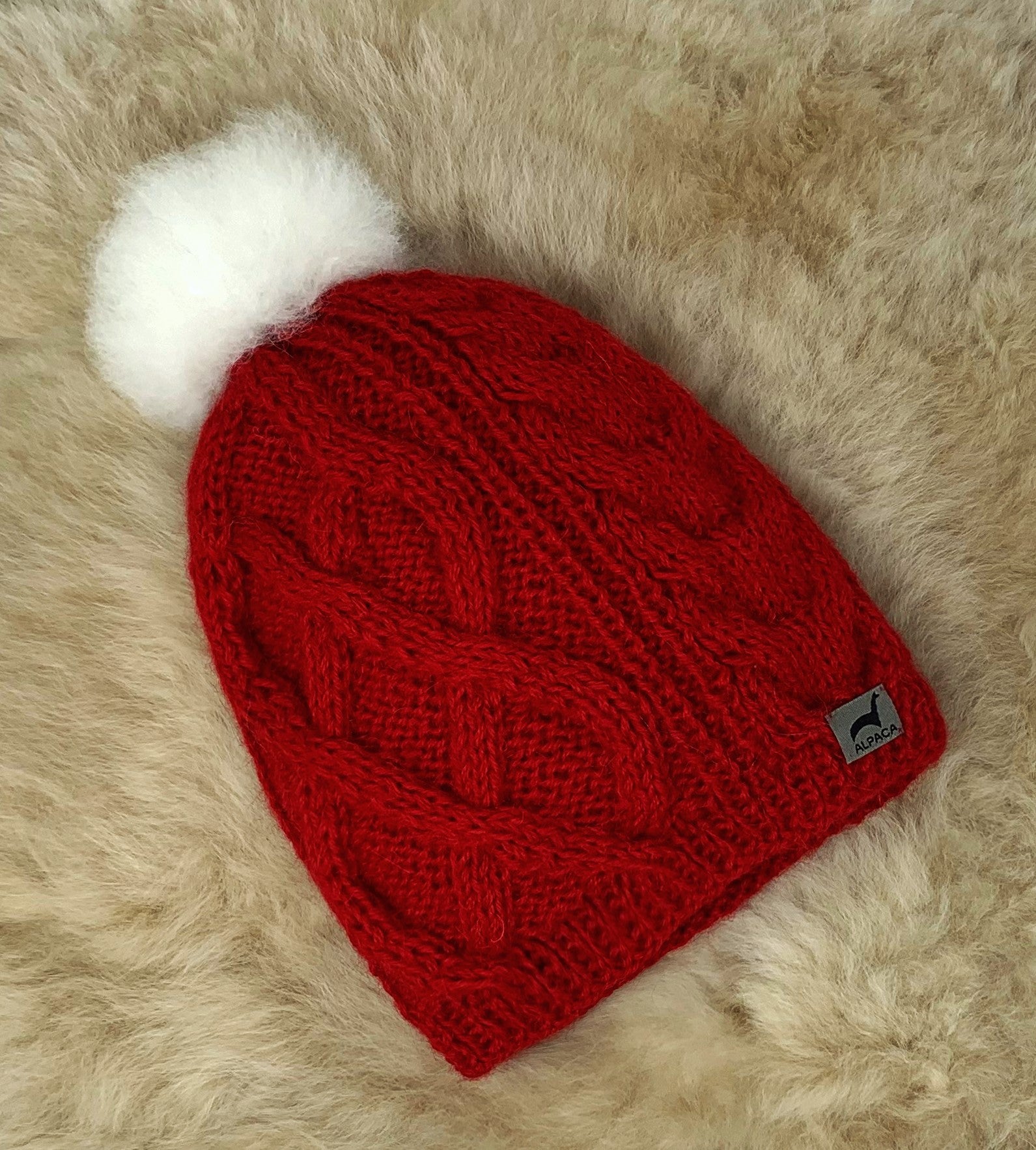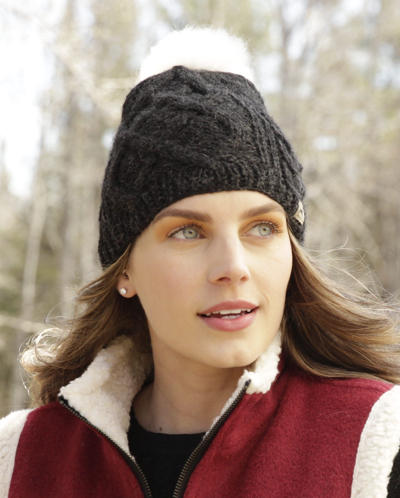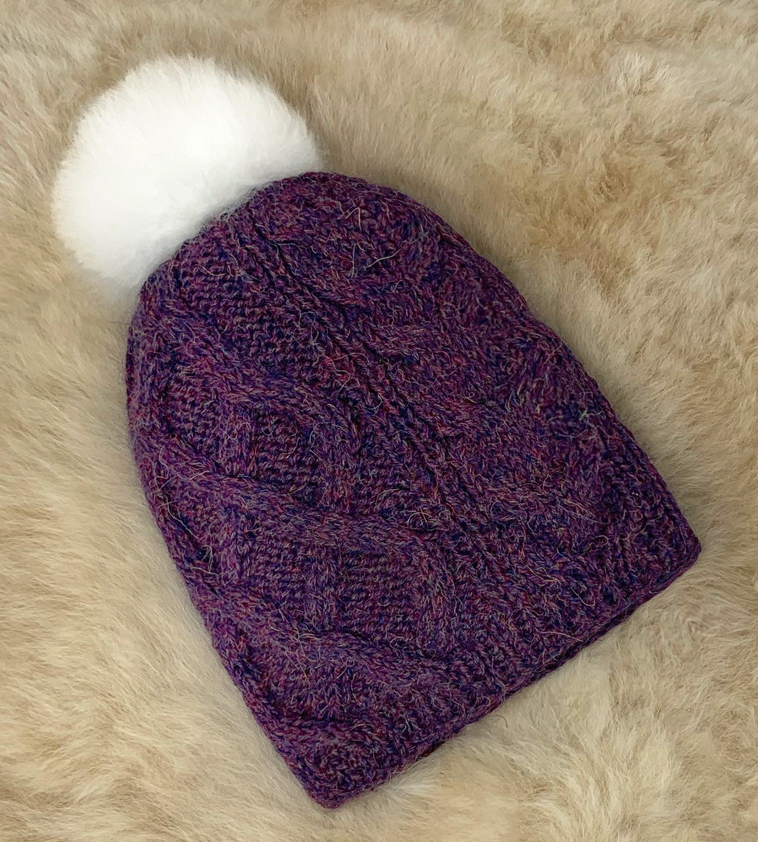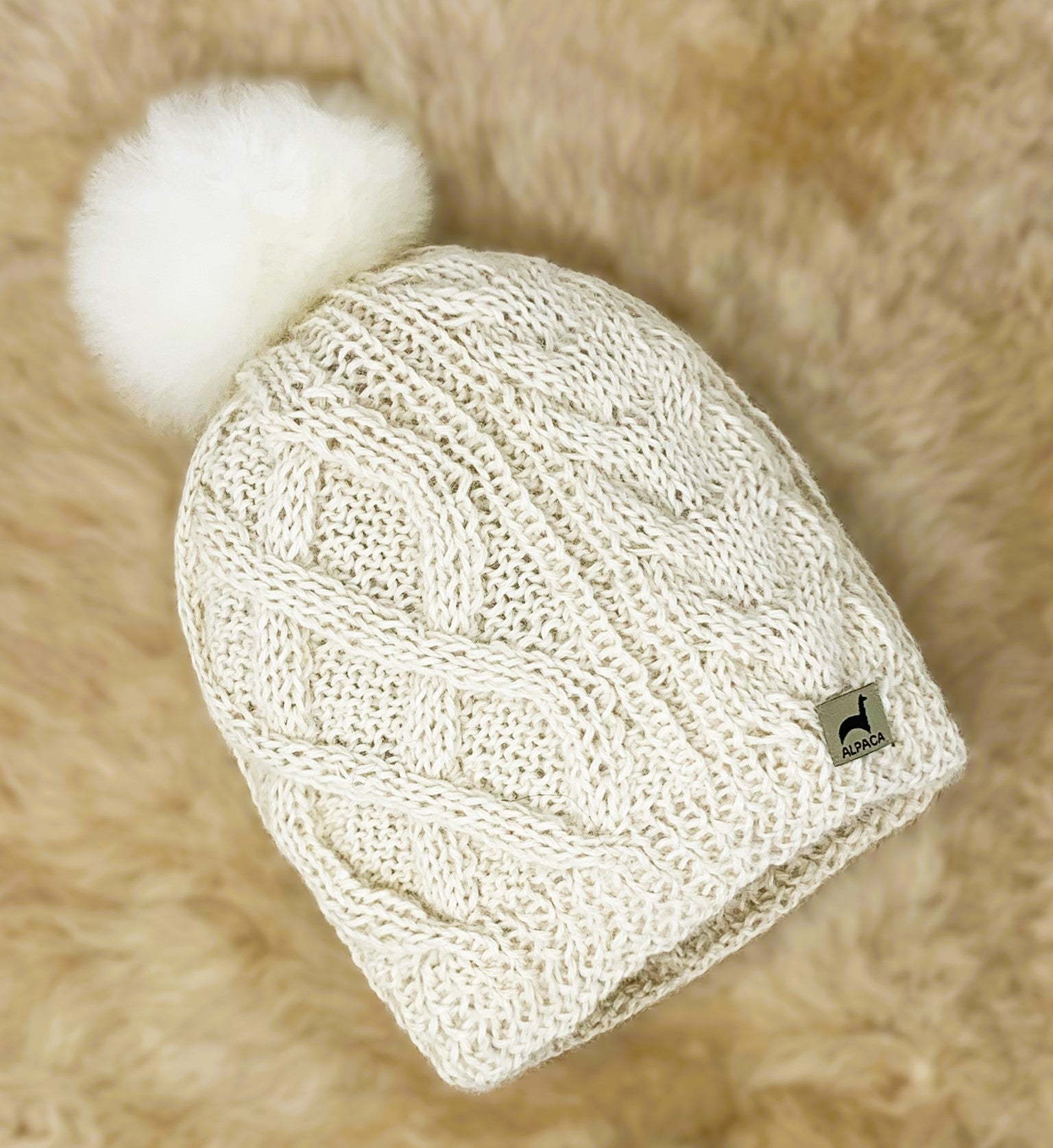 This hand-crafted Pom Cable Hat features a classic trenza knit pattern, showcasing expert craftsmanship. Topped with a soft white alpaca pom pom, it combines timeless style with exceptional warmth and softness. Ideal for cold weather, this hat offers both comfort and durability, making it a refined accessory for any winter wardrobe.