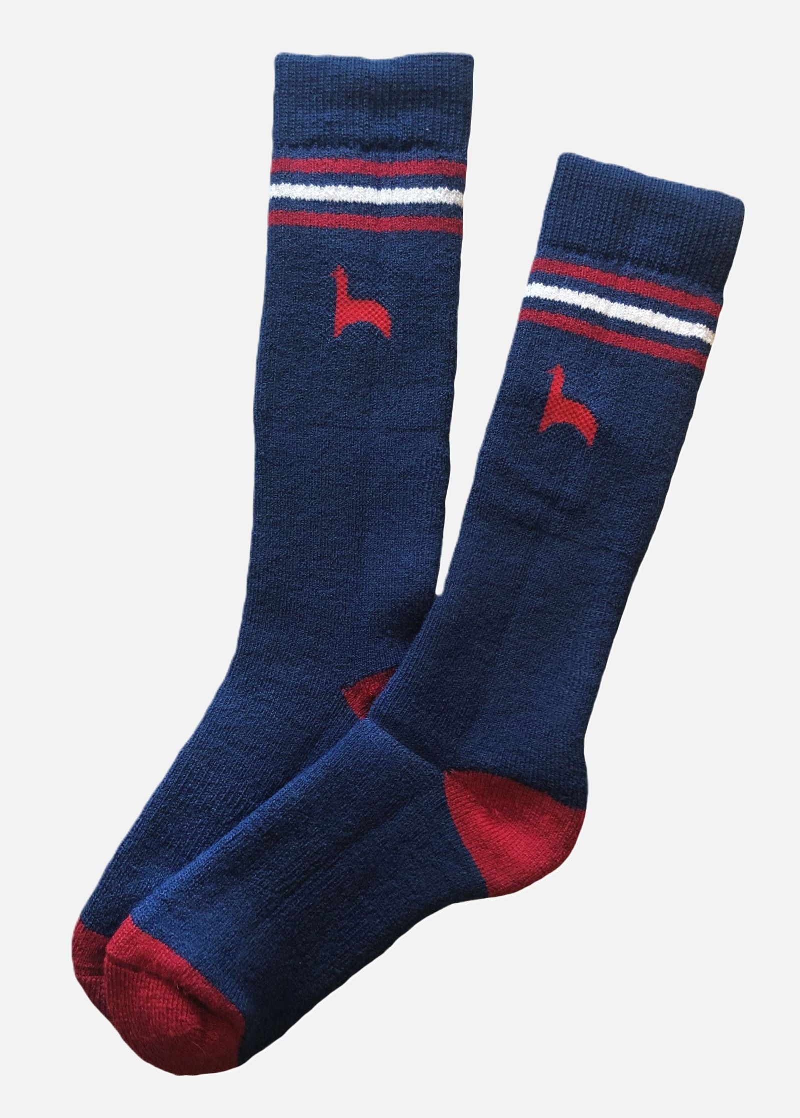 Elevate your sock game with the Courtyard Alpaca Sock – where sporty prep meets everyday comfort and style. Crafted with meticulous attention to detail, this classic navy sock, adorned with striking red and white stripes, effortlessly blends form with function. The elasticated band at the top ensures a secure fit, while the reinforced heel and toe provide unparalleled durability.