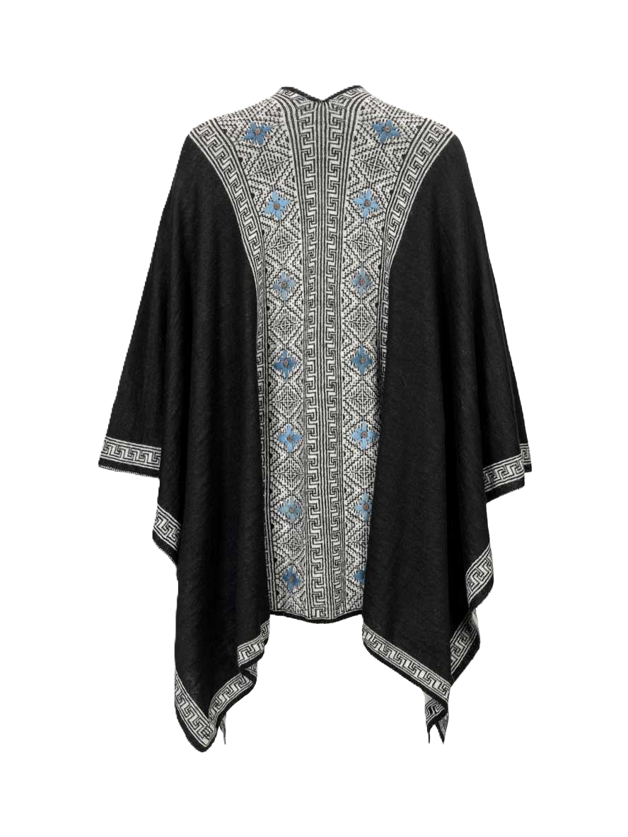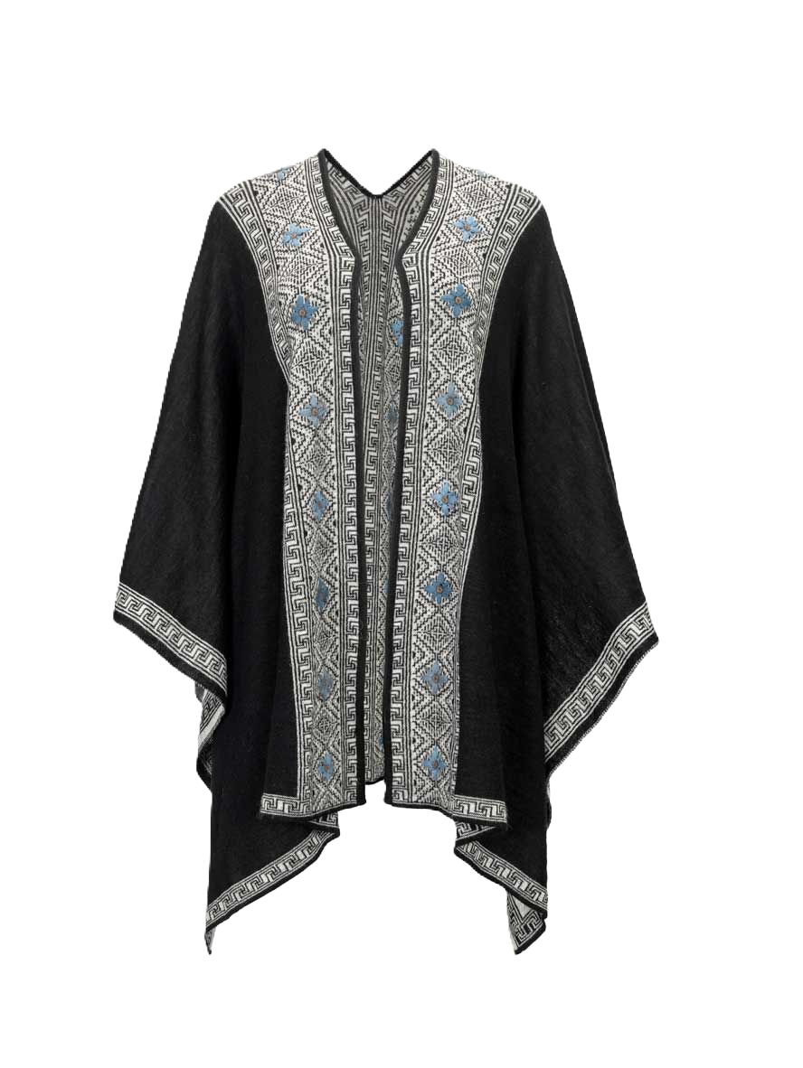 Step into the world of timeless elegance with the Artemis Reversible Alpaca Ruana. This exquisite piece effortlessly combines classic colorways with a striking Greek Keyhole pattern, making it a true fashion statement. Pair the heather grey side with jeans for a chic and cozy everyday ensemble or turn heads by donning the sleek black side for a captivating date night on the town.