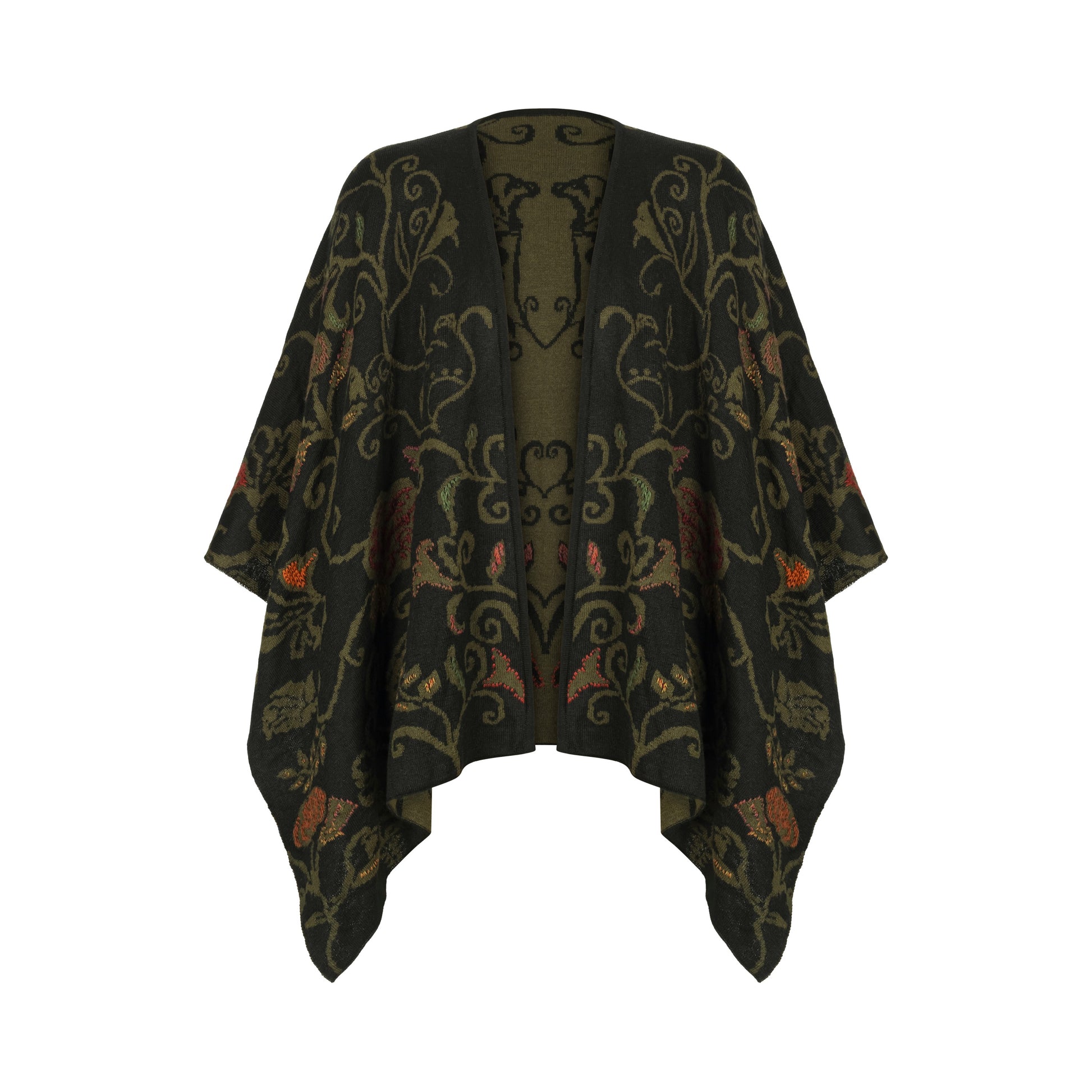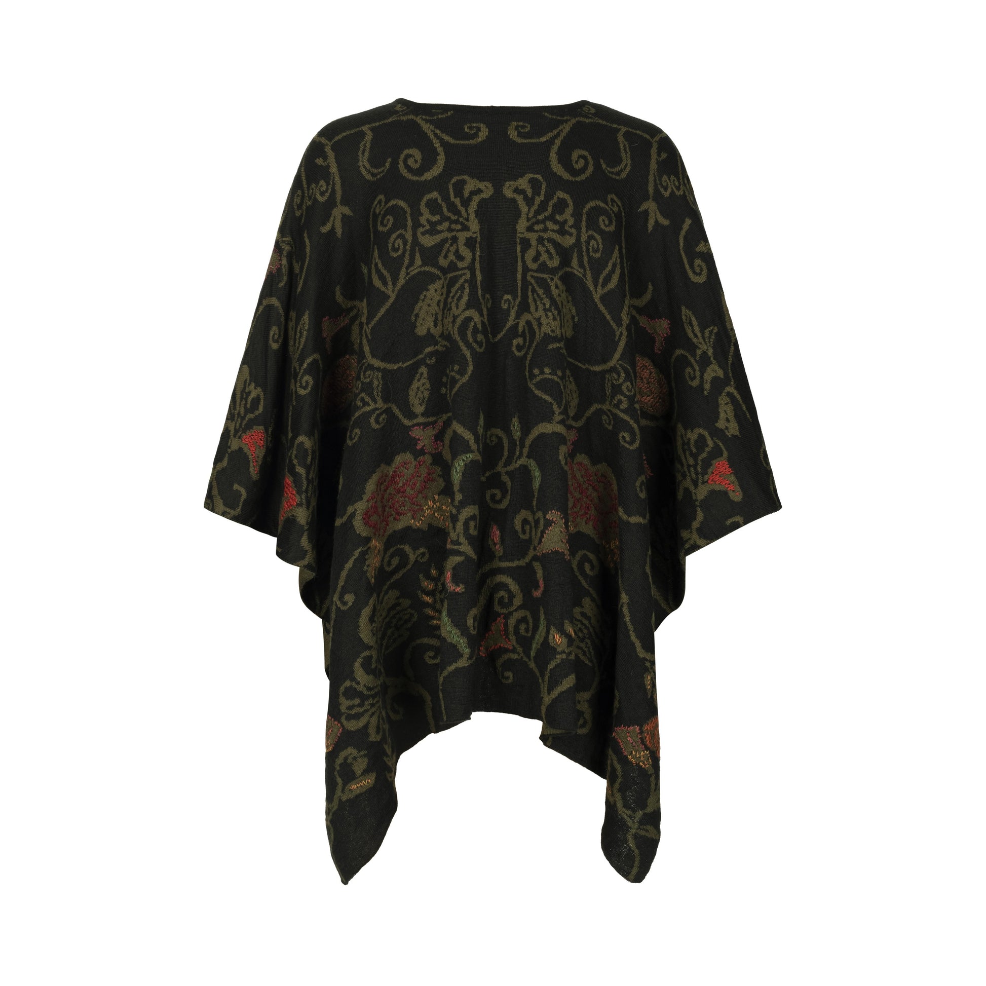 Prepare to be enchanted by the sheer elegance of the Emerald Reversible Ruana! With its mesmerizing moss green and rich black hues, a breathtaking display of vibrant floral trails, delicate vines, and graceful ferns, finished by a charming black crocheted border, this Alpaca ruana doubles down on sophistication and artistry. Truly spellbinding!