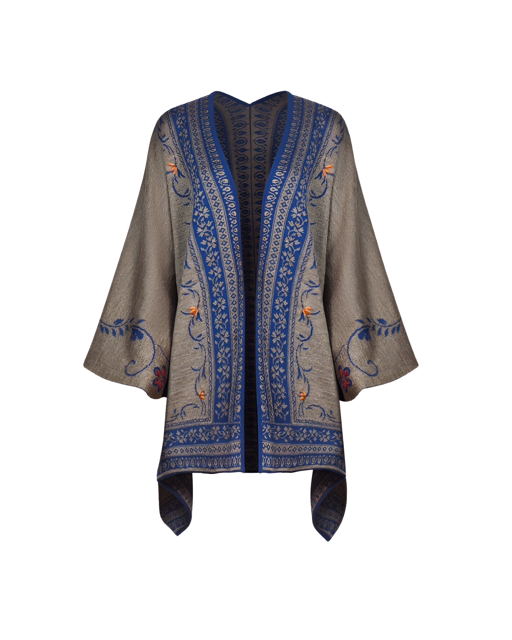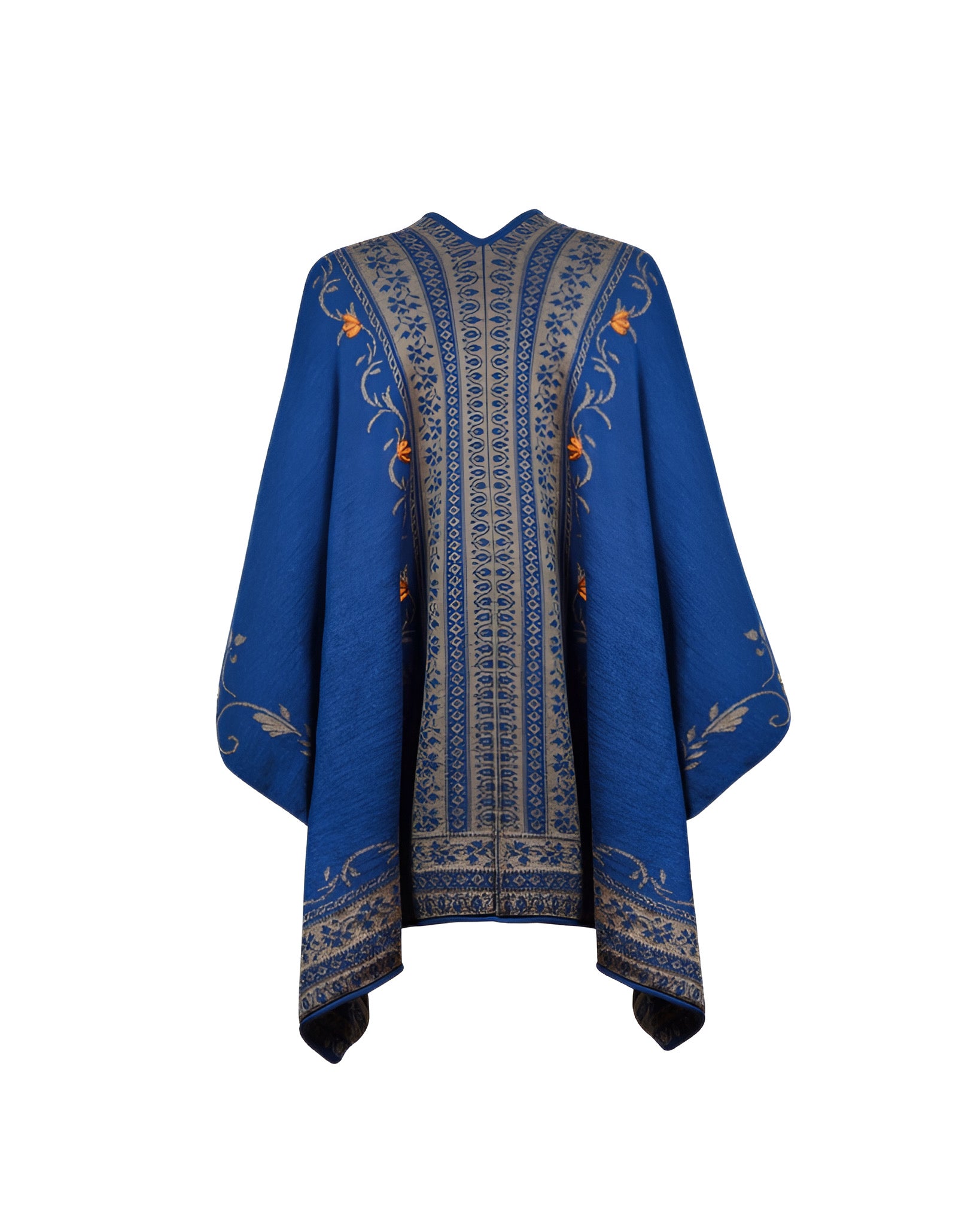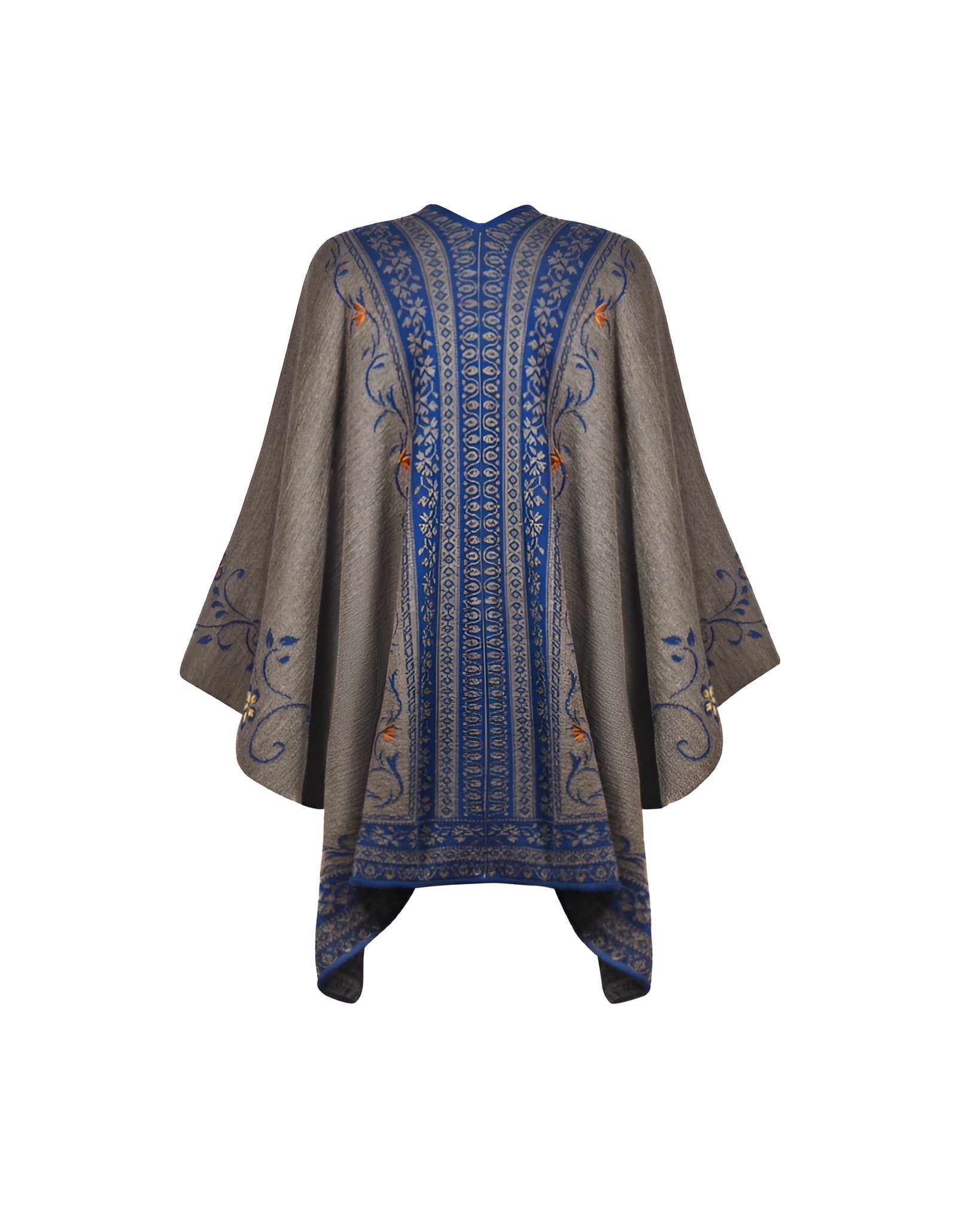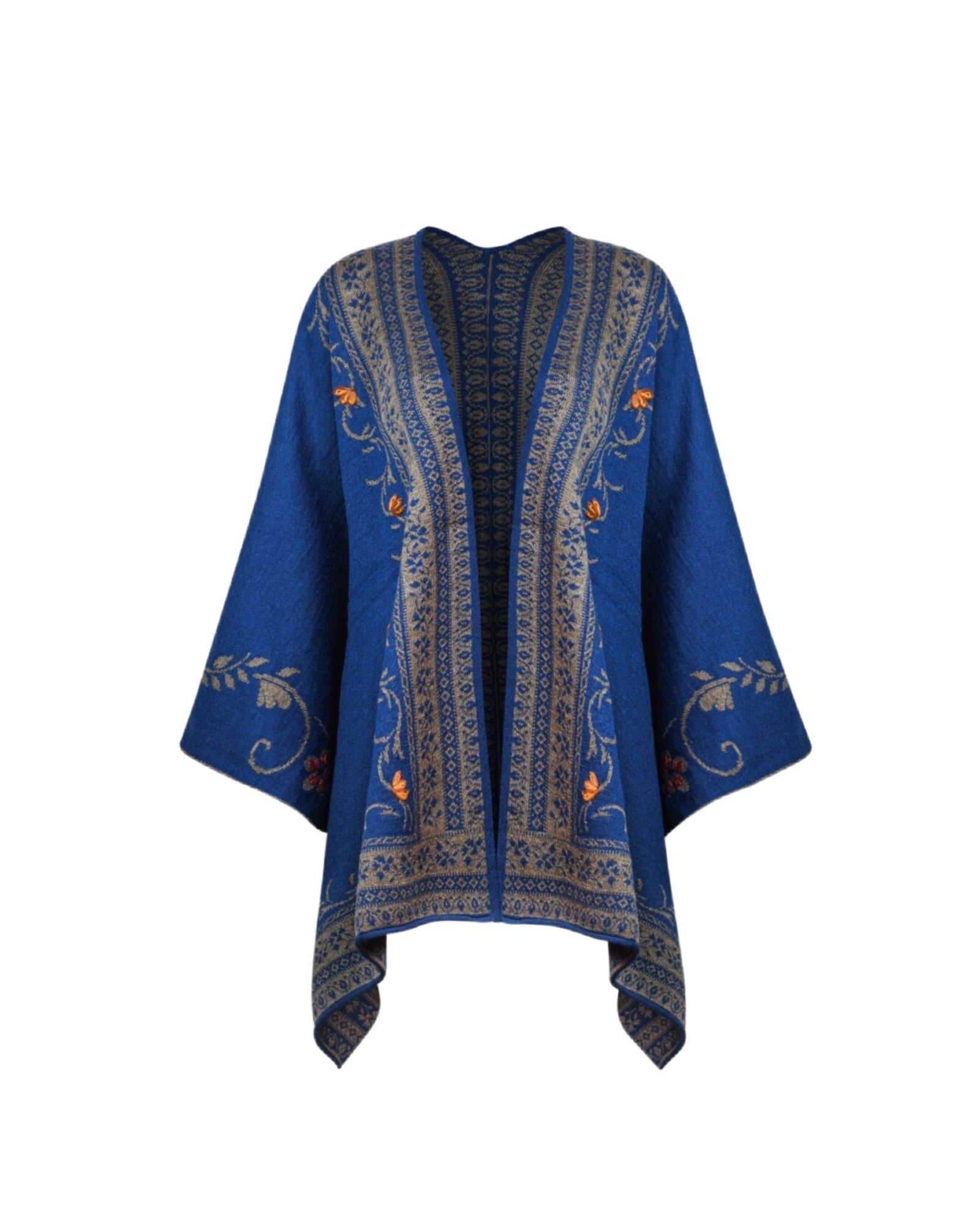 Introduce a luxurious layer to your wardrobe with our Trellis Reversible Alpaca Ruana. Adorned with a beautiful trellis design in blue and beige tones, this ruana adds a touch of elegance to any outfit. Made with soft and warm alpaca fabric, experience the comfort and sophistication of premium quality.