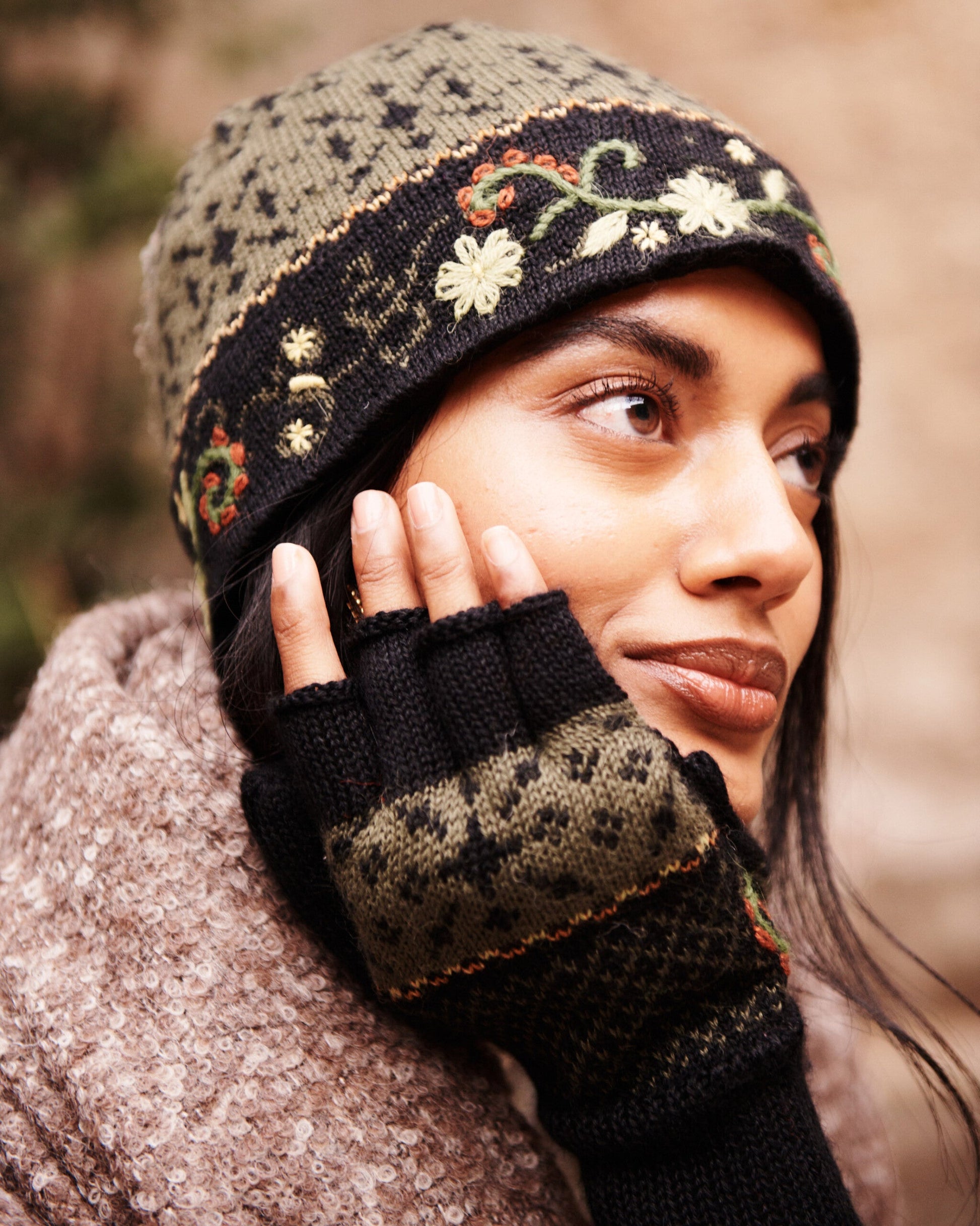 These fleece-lined glittens sport a hand embroidered forest design atop a rich black and mossy green pattern.