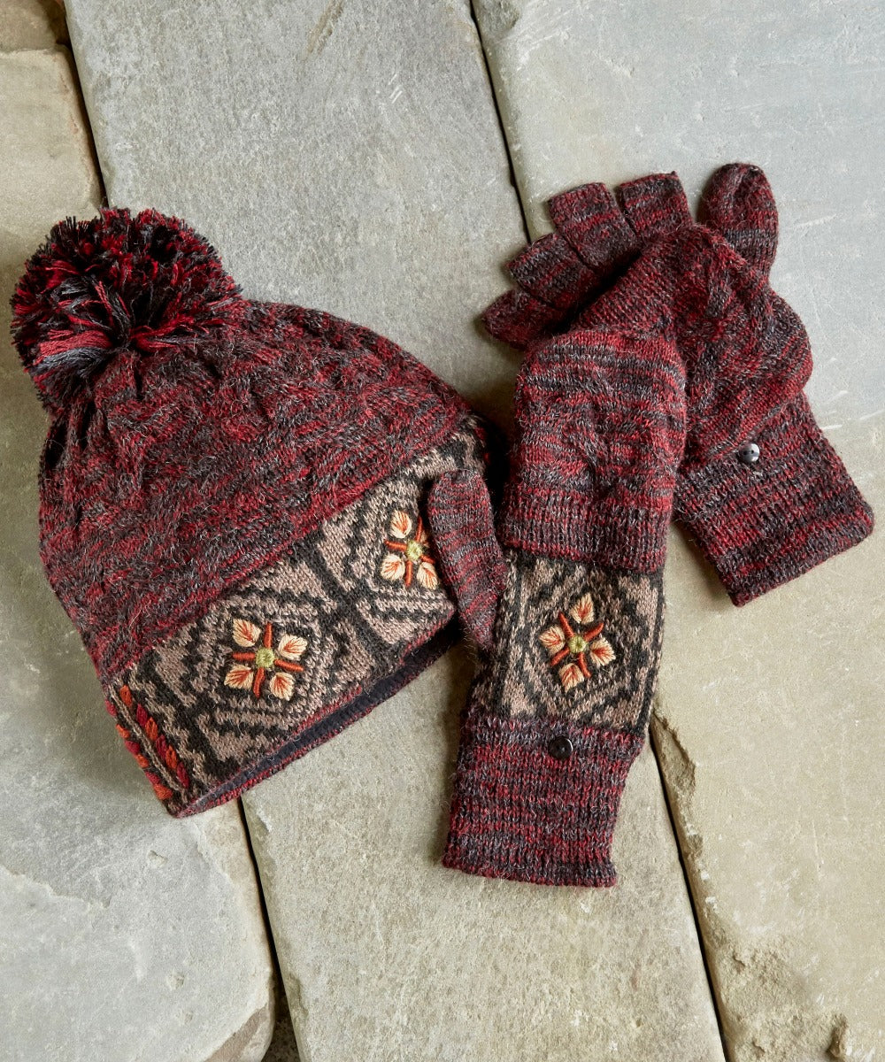 Our Harvest Mosaic Glittens brings a toasty feeling just by looking at them. Subtle red melange and hand embroidered motifs really bring a vivacity and warmth to you look, while full fleece lining brings warmth to your body. Match with the Harvest Mosaic Hat for the full look!